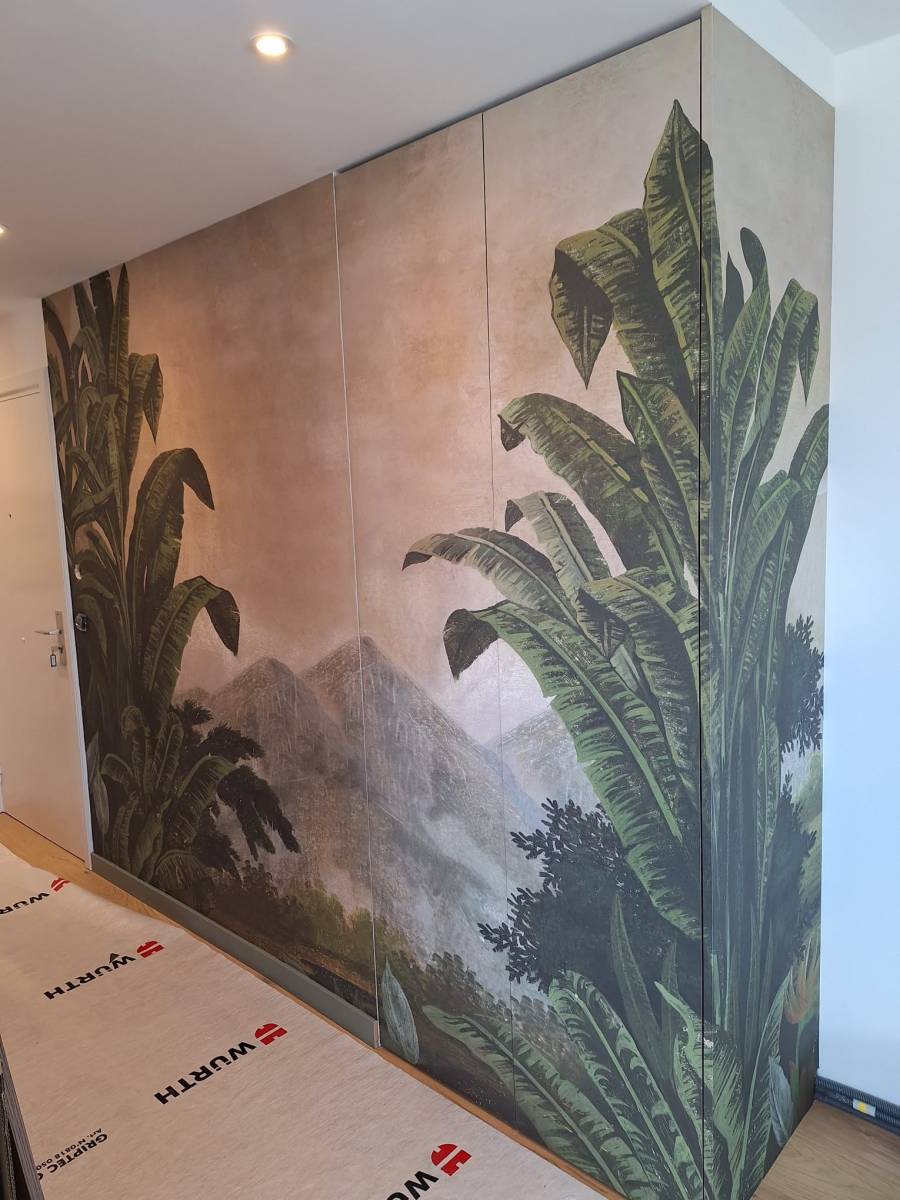 Notre entreprise a déjà été sollicitée pour ce type de chantier. Nous avons récemment customisé un placard dans une entrée (cf. photos). Nos clients ont opté pour un papier peint représentant un paysage de montagne, avec en premier plan, d’immenses feuillages.